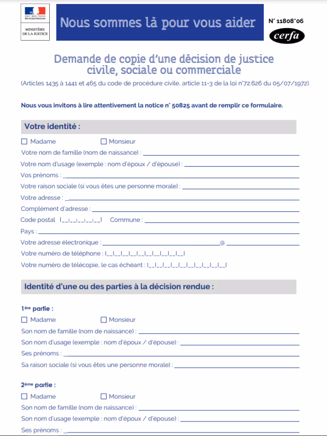 Tout d'abord, vous pouvez demander une copie du jugement en ligne. Vous devez utiliser le formulaire cerfa n°11808*04, qu'il est possible de compléter soit à la main pour l'envoyer ensuite au tribunal concerné, soit directement en ligne.