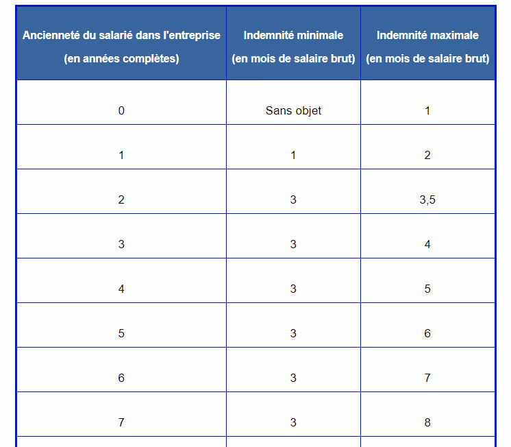 - Depuis septembre 2017, le gouvernement Macron a instauré des plafonds minimum et maximum pour le calcul de cette indemnité. Ces plafonds sont calculés selon la taille de l'entreprise et l'ancienneté du salarié.