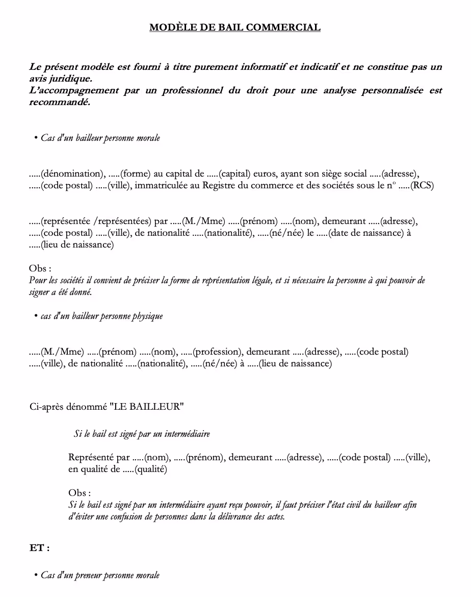 Le contrat de bail commercial étant encadré par certaines dispositions légales, un modèle de contrat est disponible ci-dessous à titre informatif.