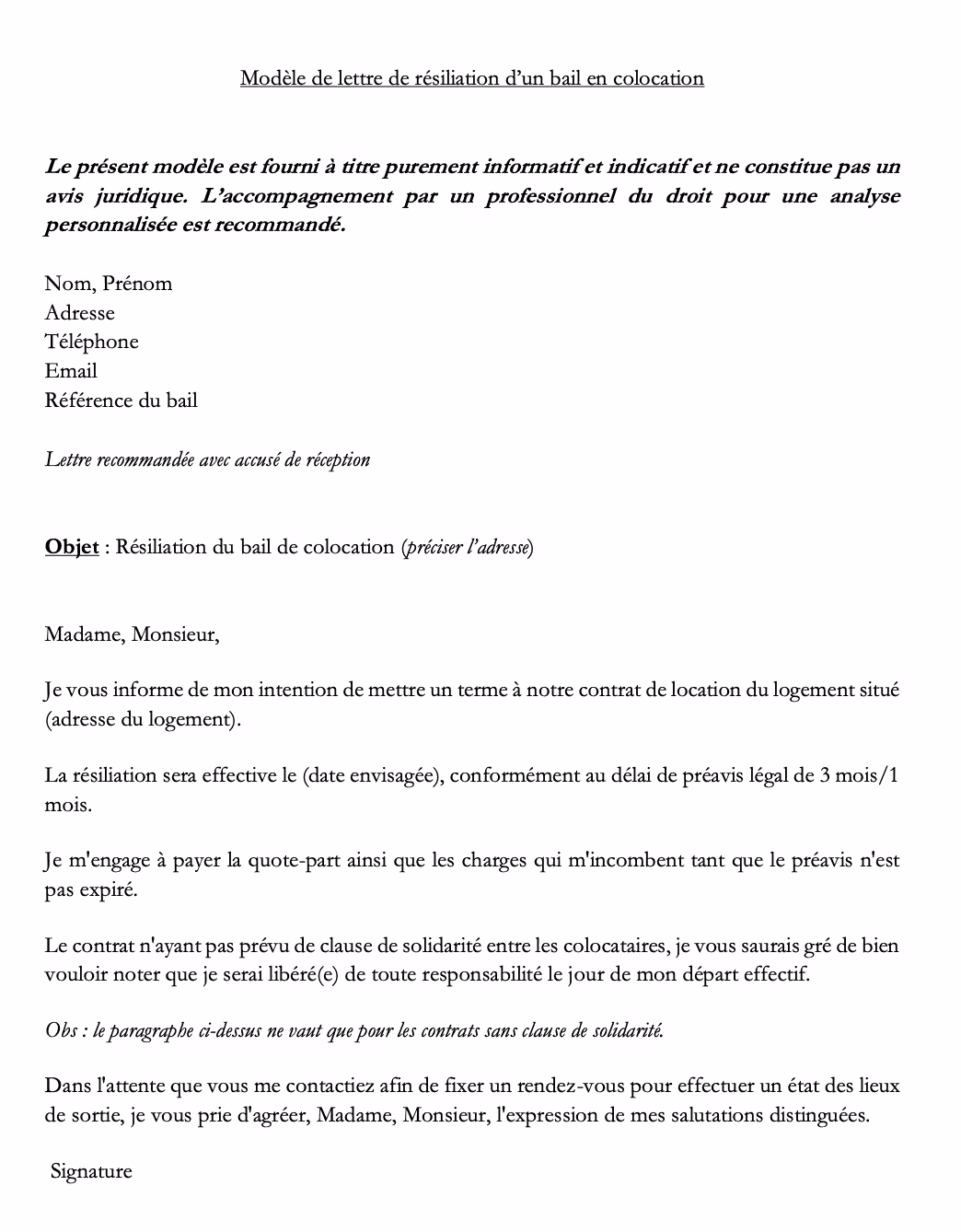 Un modèle de lettre de résiliation du bail en colocation est disponible ici à titre informatif.