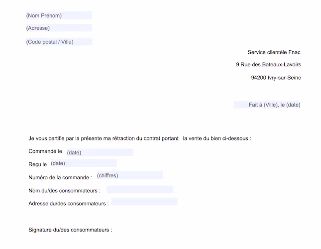 - soit en les renvoyant directement à la FNAC, dans un délai de 15 jours à compter de votre déclaration de rétractation ou l’envoi du formulaire.