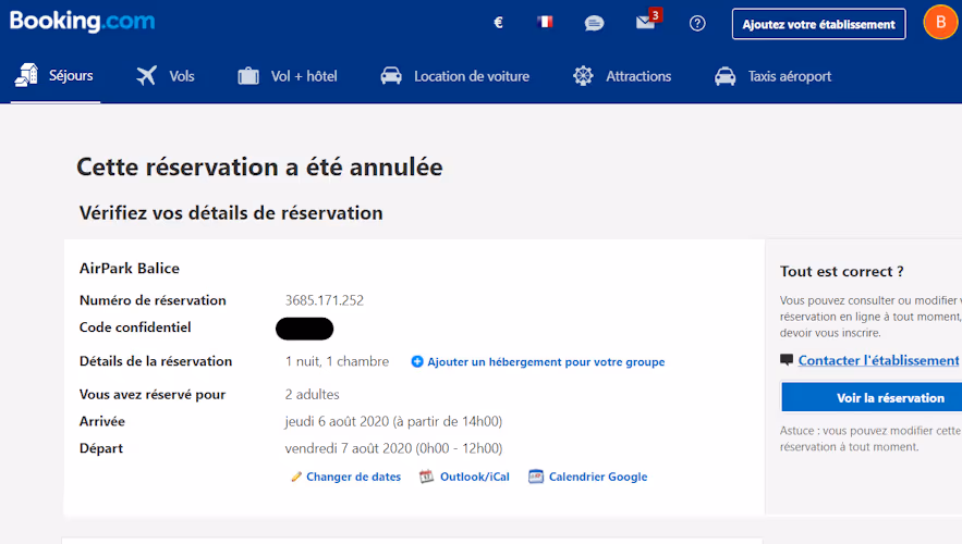 - enfin, vous avez la possibilité d'annuler votre réservation directement depuis votre espace client, sur le site de Booking.com.
