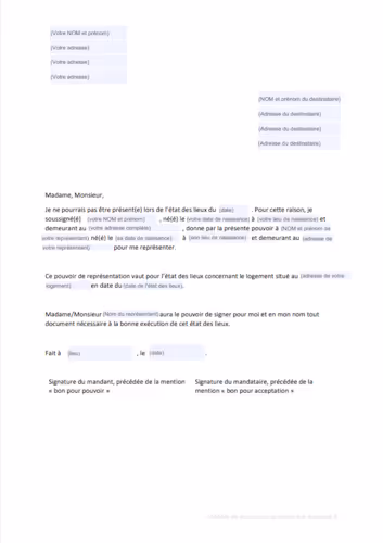 Pour cela, vous devez donner à la personne qui doit vous représenter une procuration. Ainsi, votre représentant aura la possibilité d'assister à l'état des lieux et de signer les documents nécessaires à son bon déroulement.