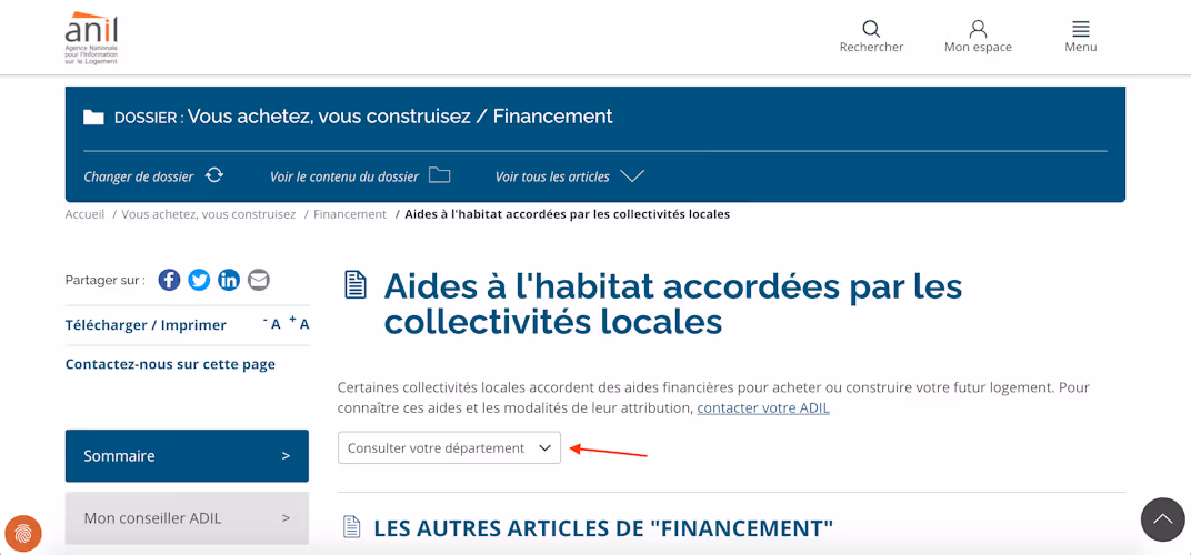 Vous pourrez alors avoir accès aux aides financières et leurs modalités d'attribution en fonction de votre département. Vous pourrez alors consulter une liste de chaque commune proposant un crédit collectivité territoriale pour le département que vous avez renseigné.