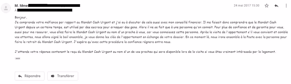 🔦 Voilà un exemple de situation dans laquelle un escroc essaie de faire accepter à un potentiel locataire d'un logement de lui fournir un mandat cash :