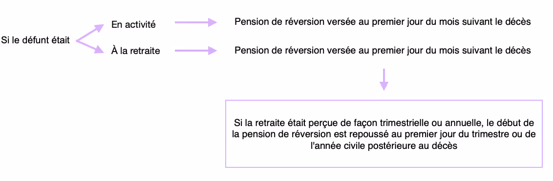 - Si le défunt était encore en activité, la pension de réversion est versée au premier jour du mois suivant le décès.