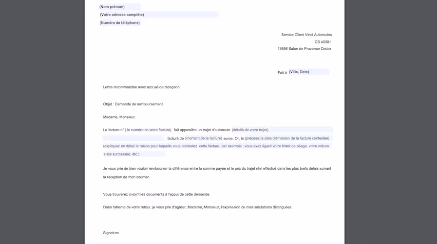 📝 Si vous souhaitez adresser une lettre de réclamation auprès du service client de Vinci autoroutes, vous pouvez remplir notre modèle de lettre en cliquant l'image ci-dessous.