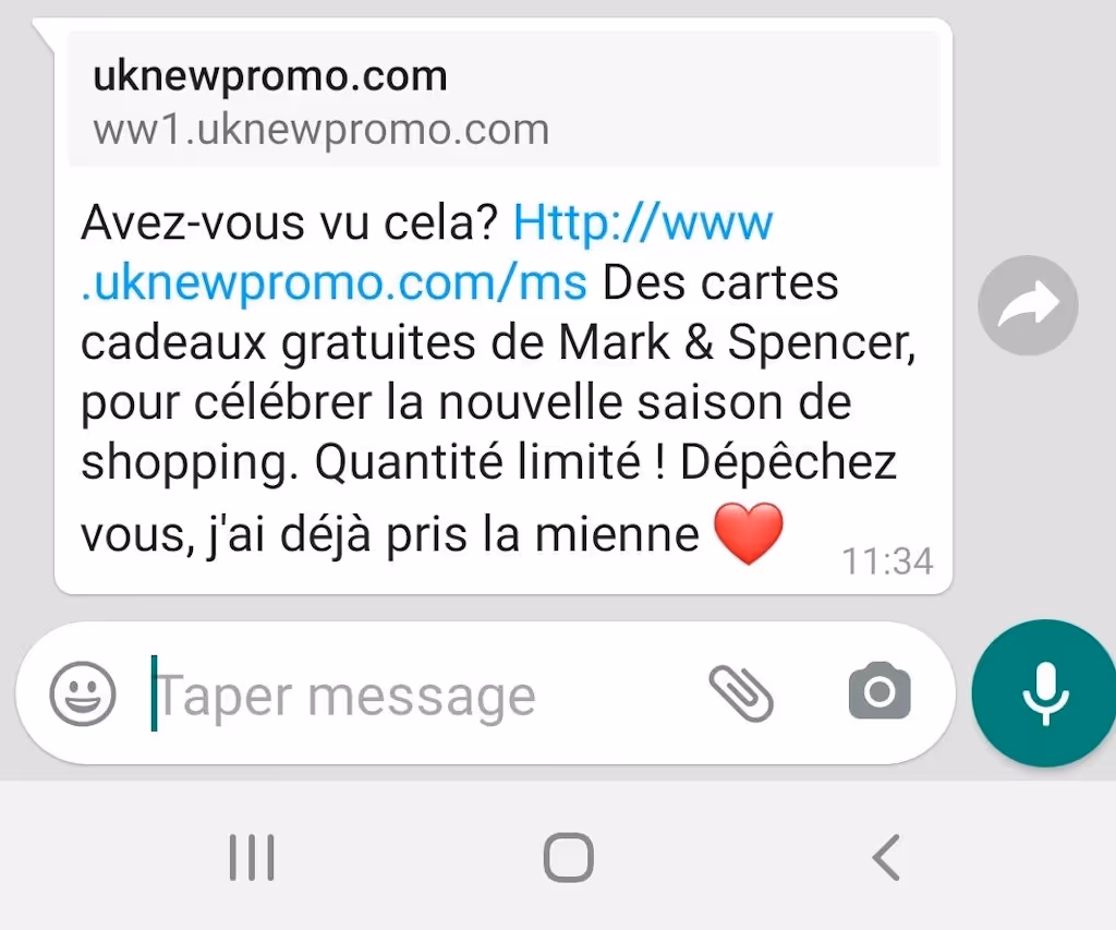 Lorsque vous recevez ce type de message, il est très important de ne pas répondre. Vous pouvez, en revanche, vous rendre sur le site officiel de l'enseigne en question, pour savoir si l'opération mentionnée dans le message existe véritablement.